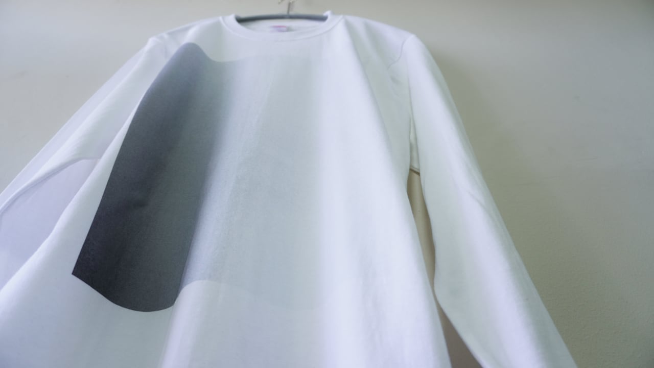 流れるように消えていくデザインが全面に施されたロンTです。
